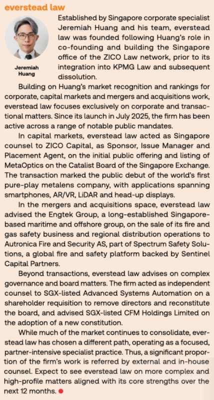 ALB rightly notes, “Singapore’s legal market is being reshaped by emerging boutique firms. With specialized expertise, client centric service, and technology enabled innovation, they are challenging traditional approaches and excelling in targeted practice areas against a backdrop of expanding Southeast Asian cross border work. As in previous editions, ALB highlights the rising firms defining the future … While much of the market continues to consolidate, everstead law has chosen a different path, operating as a focused, partner-intensive specialist practice … Expect to see everstead law on more complex and high-profile matters aligned with its core strengths over the next 12 months“.
